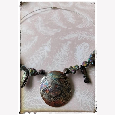 The centre piece is a 3cm textured copper and silver disc, heat treated to show a rainbow of colours.