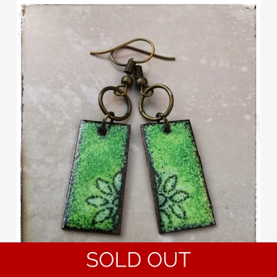 These pretty little earrings are handcrafted in copper and powdered glass. Heated in my kiln they transform into unique pieces or wearable art.