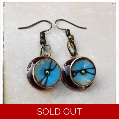 These pretty little earrings are handcrafted in copper and powdered glass. Heated in my kiln they transform into unique pieces or wearable art.