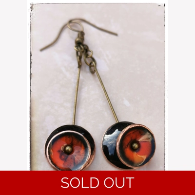 These pretty little earrings are handcrafted in copper and powdered glass. Heated in my kiln they transform into unique pieces or wearable art.