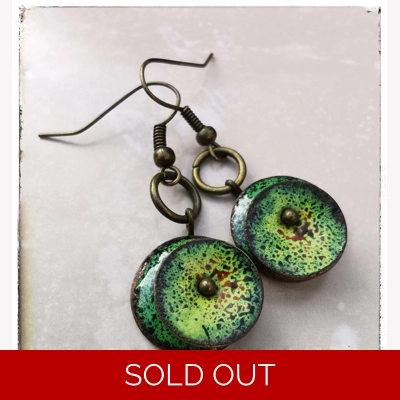 These pretty little earrings are handcrafted in copper and powdered glass. Heated in my kiln they transform into unique pieces or wearable art.